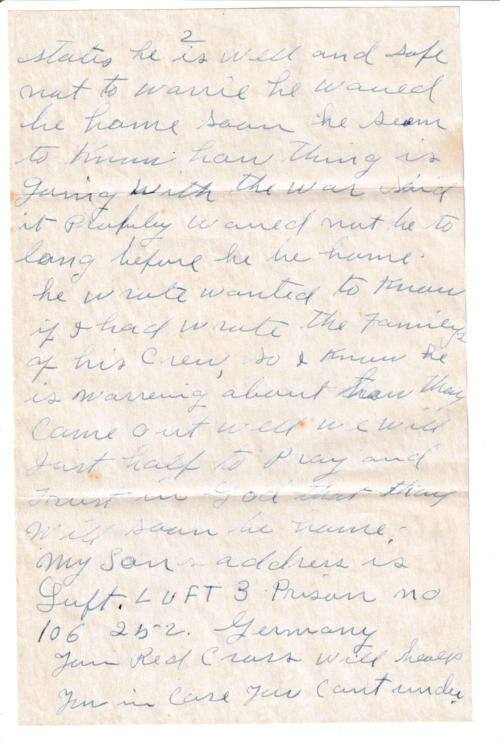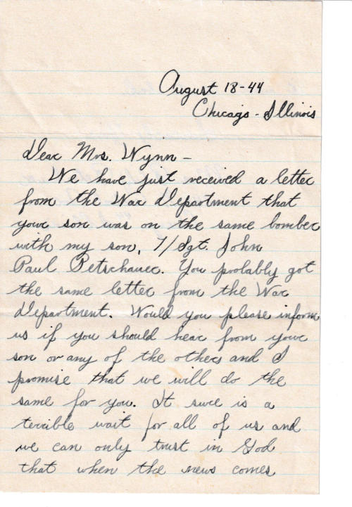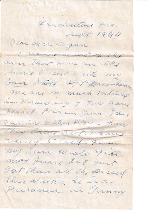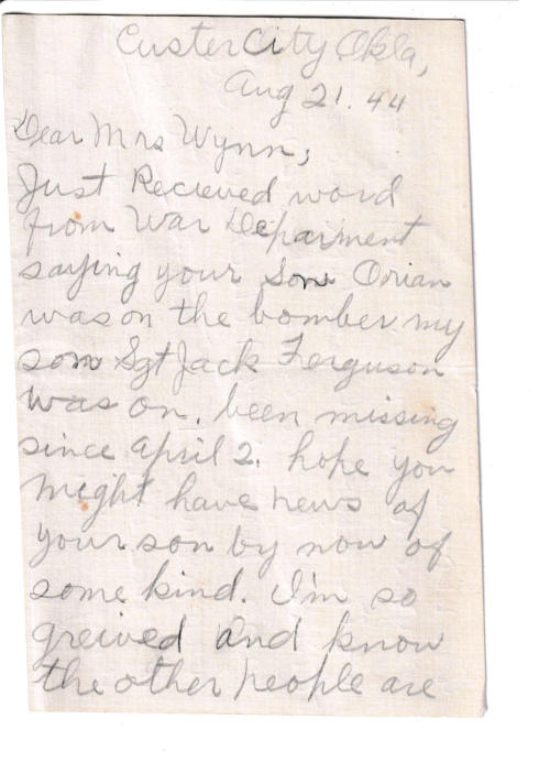 -----------------------------------------------------------------------------------------------1c CREW SECTION (Docs down below)*Other than Wynn & Zuidema-Records. Preserved Docs in Family *heritage)*B*Backman, Albert •POW•Correspondence -see rightoBackman, Edith (Mrs.) (by Mail); Address: 823 G St.. Centralia, WAoDate(s): ▪1944/08/29 ▪1944/10/25. sent to Anallene Wynn. Letter itself shows 1944/10/23: Mentions a postcard directly from Albert postmarked April 17. 1944 which said he is "a prisoner of war in Germany and is safe and well." Also, someone from "here" - her area - said "he had been in the same prison camps with our boy [Albert] and had last seen him in August. Was able to send a parcel and letter to Albert, having received official instructions from the War Department.Bailey Jr, Ed•(Navigator) Stalag-Luft 3•POW •Correspondence oBailey, Peggy (Mrs. E. O. Bailey, Jr. ) 1669 Peach Ave, Memphis, TNoDates: ▪1944/10/17 Correspondent material: son moved to Stalag-Luft 3, only 85 miles from Berlin. 1944/10/17 the camp where her son was held also had the fliers of the R.A.F as captives, as well. Peggy had two younger sons she felt would probably fight in the Pacific, "a mighty bad lot." Second hand information that an eyewitness in another plane saw Orian's plane going down; before that 7 parachutes open [later Zuidema said only 3 bailed using parachutes]*F*Ferguson, Jack L. (Sgt) •MIA•Was on bomber with Orian, MIA was one of several listed missing in action•Correspondent: Florence I (sp?) Ferguson, Custer City, OKla R#2, Bx 41; had heard word from (likely Mrs.) Petschauer.•https://www.honorstates.org/index.php?id=101102*J*Jones, William (Bill)Jorgun (sp?), MoraCorrespondence Date: 1944/05/09 to Anallene Wynn*L*Luft, Walter copilotWalter E LuftBorn: 1 April 1917Died: 4 February 1976Military ServiceBranch: ARMYRank: FIRST LIEUTENANTConflict: WORLD WAR IITranscription: 1st LT Army Air Forces World War IIhttps //billiongraves com/grave/Walter-E-Luft/32129093*M*Masonheimer Bernard R Staff Sgt (Bernie, B.R., or “Buddy”) Position on plane/mission: btg•POW Stalag 17 (18 months)•fall turret gunner, gunnery training in Mission, TX•died 14 Jan 2009 (aged 92)•Correspondence: 1944/09/20-mother, Address 711-27 Ave, Brandenton, FL-https //www ancientfaces com/person/bernard-r-masonheimer-birth-1916-death-2009/42685440https //www findagrave com/memorial/63281061/bernard-rider-masonheimerhttps //airforce togetherweserved com/usaf/servlet/tws.webapp.WebApp?cmd=ROHSBV&type=Person&ID=209490Miller, Walter A. (Sgt) •POW was on same bomber with Orian, POW by Germans perhaps released May 25•Correspondent: Mrs. Emma Miller, 2834 Chicago Ave South, Apt 202, Minneapolis, Minnesota, (Formerly 3300 Clinton Ave S.)•Another Walter A miller, perhaps as found:•Edit entry Walter A Miller copilot•Killed in Action (KIA) near Zwickau in B-17 'Smokey Liz II' #4337542 perhaps Mar 19 1945*P*Petschauer, John Paul Technical Sergeant Service number assignment was 6731215.•MIA Engineer MICorrespondent: Mrs. Philip [one l in Philip] Petschauer, 340 N. Central Ave, Chicago, IL•Listed as having lived in Cook County, Illinois•Service Number: 6731215•https //www honorstates org/index php?id=324378•https //www abmc gov/decedent-search/petschauer%3Djohn•https //www bundesheer at/download_archiv/pdfs/missing_in_action.pdf•https //www armyaircorpsmuseum org/missing-in-action/petschauer-john-mia-13771.cfm•https //www findagrave com/memorial/56374809/john-p-petschauerHonor States lists Petschauer as MIA, Declared Dead while missingArmy Air Corps Museum lists Petschauer as: “highly recoverable” 4c DOCUMENTS-CREW1-BACKMAN, ALBERT (Wife Edith, Centralia, WA)2-BAILEY (Jr.) ED O (Navigator) (Mrs. Peggy E.O. Bailey) Stalag-Luft-3 85 miles from Berlin; flyers of RAF* also there*Royal Air Force3-FERGUSON, JACK (Mrs. - Florence I, D or J? Custer City, OK)4-JONES No letters)5-MASONHEIMER6-MILLER, WALTER A. (Wife Emma 0 Minneapolis, Minnesota)7-PETSCHAUER, JOHN PAULor JOHN PHILIP (ENGINEER ) (Wife “Mrs. Philip”)8-ZUIDEMA Moved9-LUFT, WALTER No lettersUpdates: 2023/02/10 editing has been occurring this week over the past 2-3 days *CREWList of Names Same attacked/crashed planeoMiller, Walter A. (Walt)▪wgoBackman, AlbertoLuft, Walter E. ▪copilot▪mentioned in Zuidema▪Note: Lt Walter E. Luft copilot last name is same as Nazi Luft Prison System -don’t confuse the two, oBailey, Ed▪Navigator▪moved to POW camp Stalag-Luft 3 (85 miles from Berlin)oMasonheimer, Bernard R▪btg, fall turret gunner▪died Jan 14 2009at age 92oJones, Bill•Known POW CampsoStalag-Luft 3 (Bailey)o(Masonheimer)▪Stalag 17 double check this▪Luft 3 Prison no 106 2b-2 p. 2 of Vera Masonheimer letter Sept 20, 1944)•List of Names linked to Orian - see rightoABC D -E F GHI JKLoM N O P Q R S T U V-Z•POW, MIA, Killed sources•Contacts with some information in our records•Sources, ResourcesoLetters see Wynn-3 Preserved DocumentsoArticles▪Links List now on Wynn-5•Originally listed MIA or killedoFerguson, Jack L▪tailgunoPetschauer, John Paul▪engineer, tt gunUPDATES: 2022/10/15 re-arranging Crew Section; 2022/10-1/-2 Campell also added to Wynn-4 Nurse Corps section;2022/09/17 Allen Flynt section added with some letters; 2022/09/08 Orian Correspondence section added; ; 2022/09/07 Coppedge - more added; 2022/09/06 Bailey second page added; 2022/09/04 more Campbell and Silberman letters added; War Dept and Telegram added to Irian-Military section; 2022/09/03 Silberman section fleshed out and added to; 2022/09/02 Silberman added and started; Petschaur added; Miller added; Comments moved to Wynn-4; 2022/09/01; 2022/08/31; 2022/08/28 2022/08/27-4--PAGE STARTED-Orian T. Wynn Comments, Scanned Documents