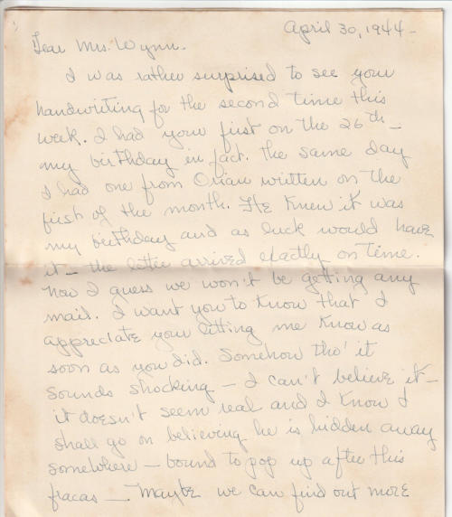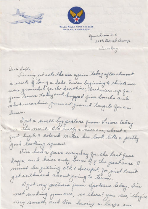 ---------------------click to enlarge each item-------------------SCHOOLING ERA LETTERSWALLA WALLA, WASHINGTON incl. 316 Sq. 88th Bomb Grp; SWAH PROV GRP -seems to include Walla Walla hope to sort this out laterLetter List-Walla•Uncertain Dates-88th Bomb GrpoTues oThursoSun•9-8-1943•10-6-1943•10-9-1943Uncertain DatesTuesday 88th Bomb GroupThursday 88th Bomb GrpSunday 316 Sq 88th Grp - Jess Coppedge as copilot/pilot; Dear Mom and MareneWalla Sept 8-1943- Swah Prov Grp 72nd Airdrome Sq.Walla Oct 6, 1943Walla October 9,-1943BIG SPRINGS, TEXAS 1943 Big Spring Army Flying School (Bombardier)Big Spr. March 21, 1943Big Spr Mar 28 1943Big Spr. April 11KELLY FIELD, TEXAS Sept 1942Sept 25-1942San Antonio, TexasKelly Field Letterhead Squadron 113To Mom and MareneELLINGTON FIELD, TEXAS Nov. 1942Nov 11-1942Nov-30-1942MOSES LAKE, WASHINGTONSaturday (No date) 396 Bomb Grp Sq 595 BOQ 7-History NoteExcerpt: But it was on the verge of boom. The first hint of things to come came in early 1940 when rumors circulated that the U.S. Army was interested in buying a huge chunk of land near the lake for use as a desert bombing range. That didn’t happen, but when World War II started, the Army opened the Moses Lake Army Air Base just north of town for training P-38 pilots and later, B-17 Flying Fortress crews. Moses Lake, in the rain shadow of the Cascades, turned out to have ideal flying weather -- clear weather most of the time, high cloud ceilings the rest. Larson Air Force BaseMeanwhile, the Moses Lake Army Air Base was mothballed at the end of World War II, although not entirely abandoned. Then, in 1948, Moses Lake landed the biggest windfall in its history: The installation reopened as a U.S. Air Force base, the headquarters of the 325th All-Weather Fighter Wing, bringing in more than 1,000 military personnel and civilian employees. In 1950 it was renamed Larson Air Force Base, a tribute to the late fighter pilot Major Donald A. Larson (1915-1944) from nearby Yakima, who was killed in a mission over Nazi Germany. One of the tasks of the new base was to patrol the skies over Hanford’s atomic facilities and the Grand Coulee Dam.The base grew even bigger through the 1950s as it acquired a troop carrier…(cont at website)https://www.historylink.org/File/8349April 10, 1943 Hill Field, Utah, , SHORTLY AFTER SCHOOLINGNovember 11, 1943 Post- Schooling Waiting to go overseas PackingUPDATES: 2022/09/25 Big Springs no date AAFBS Class 43-6 D 6; 2022/9/24 Big Springs letters added; Swah prov grp letters added; 2022/09/22 Moses Lake, Ellington Fld, Big Springs; 2022/09/17 Schooling Era Letters started; Mar 1944 5, 6, 8, 9 added; 2022/09/16; 2022/09/14 added April 1944 section and two letters-MIA letter by War Dept and Orian’s final letter on Apr 1 1944; 2022/09/13 more on Feb 1944, mostly adding missing materials and links, added two letters for march 1944; 2022/09/12 more Jan 1944; added Feb 1944 section and some letters; 2022/09/11 Jan 1944 section added; 2022/09/10 December 1943 Orian letters added; 2022/09/09 added Family Photos section; Added Burial Site 1950s photo; 2022/09/08 Orian Correspondence section added; ; 2022/09/07 Coppedge - more added; 2022/09/06 Bailey second page added; 2022/09/04 more Campbell and Silberman letters added; War Dept and Telegram added to Irian-Military section; 2022/09/03 Silberman section fleshed out and added to; 2022/09/02 Silberman added and started; Petschaur added; Miller added; Comments moved to Wynn-4; 2022/09/01; 2022/08/31; 2022/08/28 2022/08/27-4--PAGE STARTED-Orian T. Wynn Comments, Scanned Documents