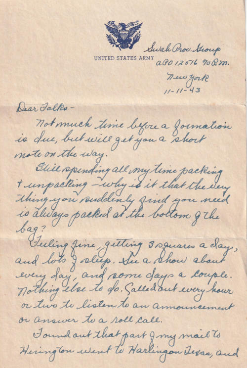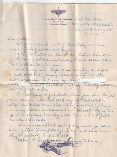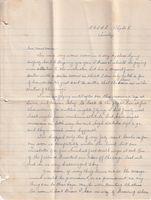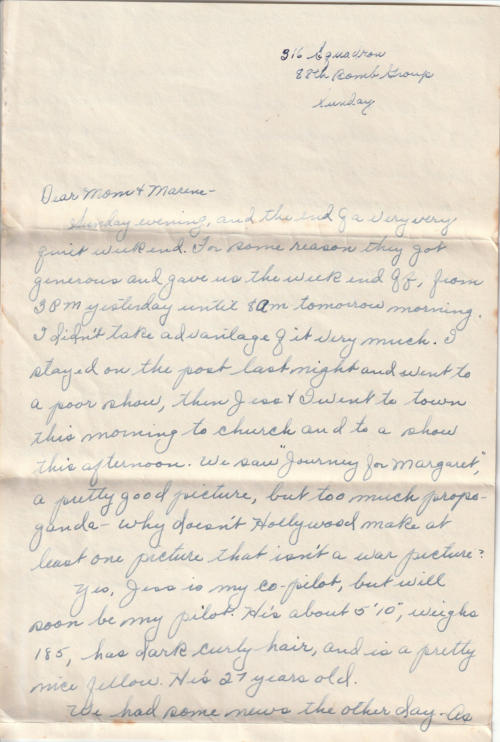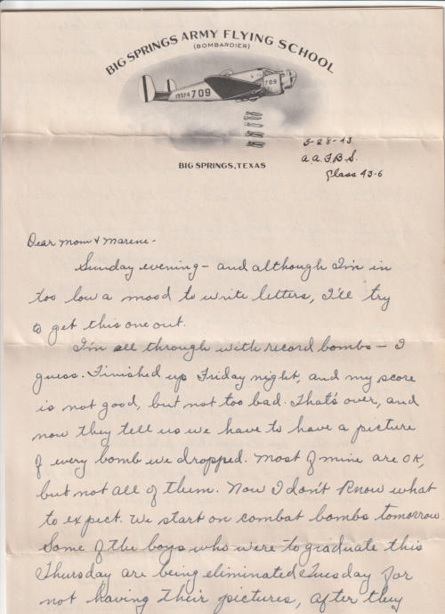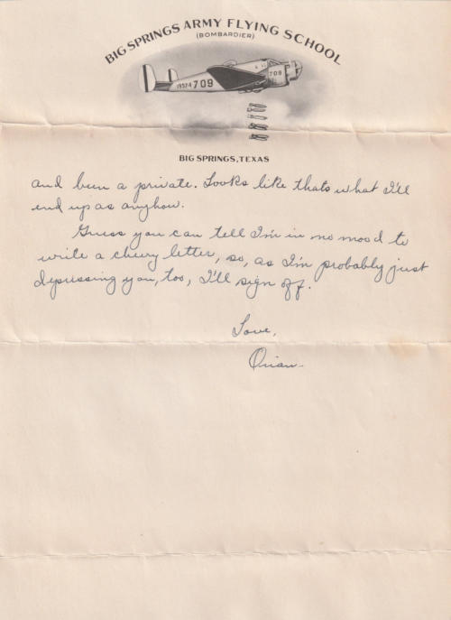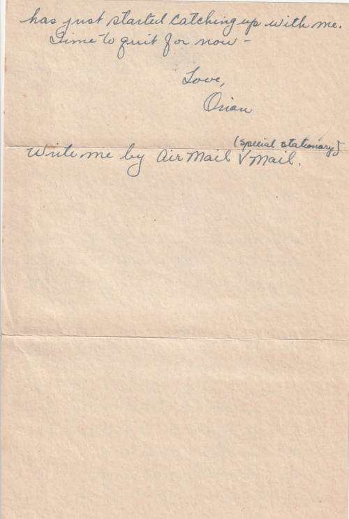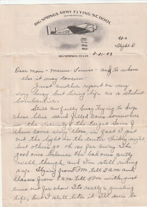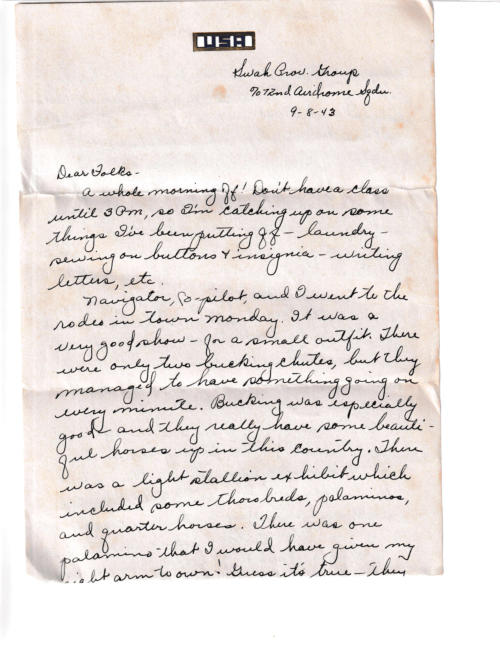 •1-Orian US Army Air Forces Bombardier 1942-44oSchooling era letters •Walla Walla, Washington▪Uncertain Dates-88th Bomb Grp•Tues •Thurs•Sun▪9-8-1943▪10-6-1943▪10-9-1943•Moses Lake, Washingtonounknown date- 96 Bomb Group Sq 595 BOQ7•Kelly Field, Texaso9-25-1942 Scolding sister Marene over dating•Big Springs, Texas 1943•Ellington Field, Texas