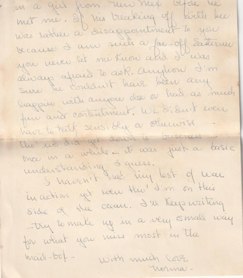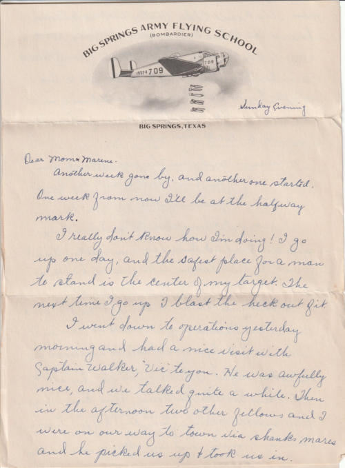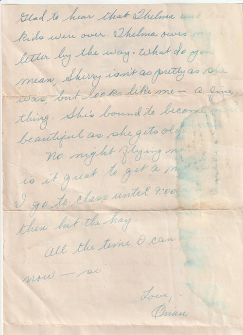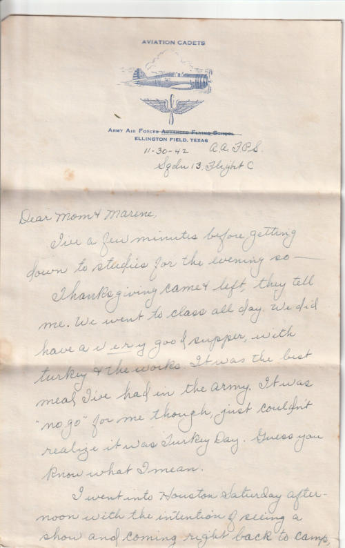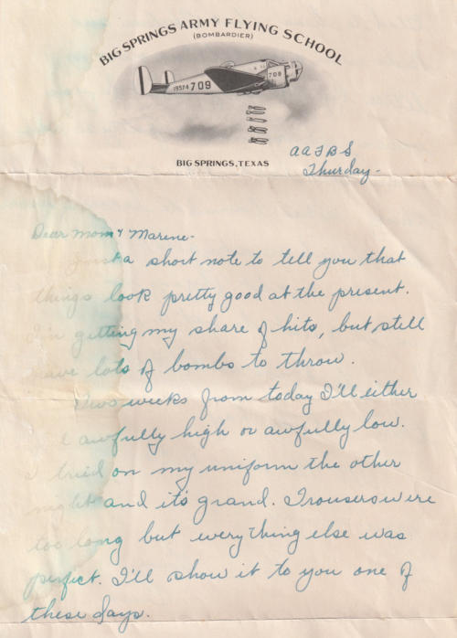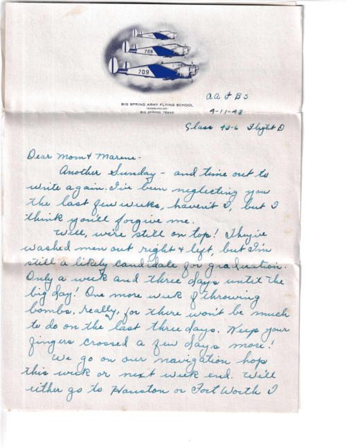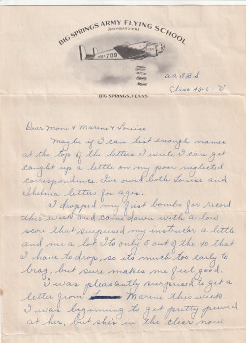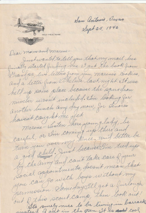 San Antonio, Texas; Sept 25, 1942Dear Mom and Marene,Just wanted to tell you that my mail has finally started finding me. I got the book from Grandpa, two letters from you, Marene’s cookies, and a letter from Thelma last night. It was held up some place because the squadron number wasn’t included. I am looking for another bunch because Lenore’s haven’t caught me yet. Marene, listen here, young lady, be careful or I’m coming up there and turn you over my knee.You’d better be a good child. Just because I’m tied up by the Army and can’t take care of your social appointments doesn’t mean you can go with boys without my permission. Someday I’ll get a furlough out of this scout camp, then look out!It’s surely nice to be living in barracks instead of out in the open. It is cool in here compared to the tents and so much cleaner. I have a nice closet in which to hang my clothes. My laundry which was lost finally showed up, so I am pretty well situated now. I guess it just takes