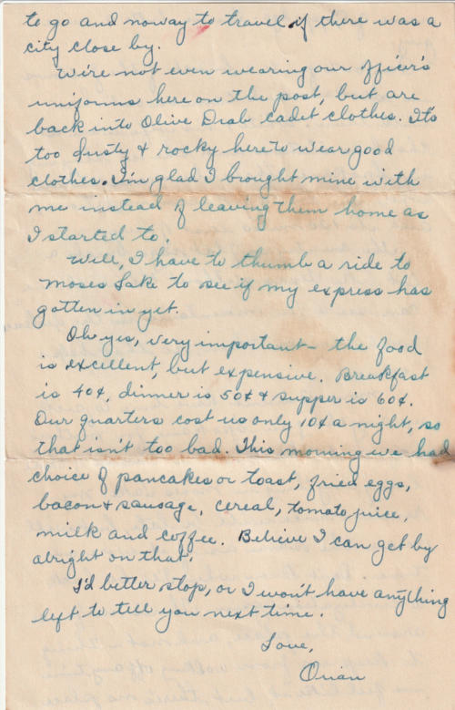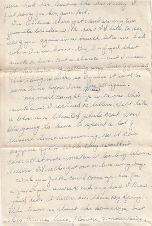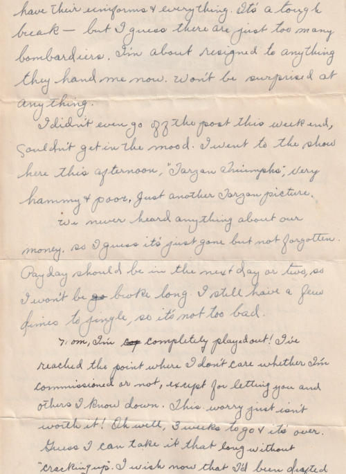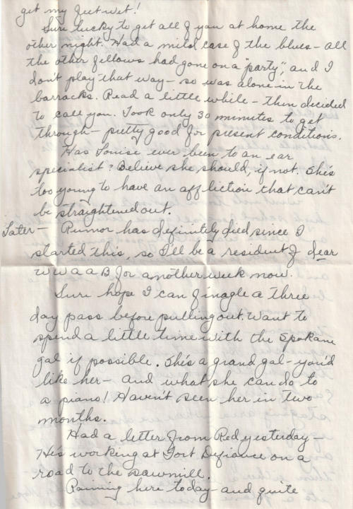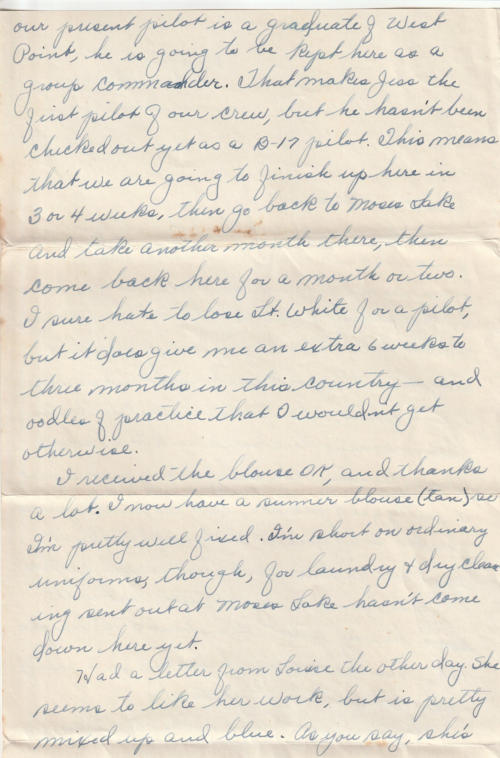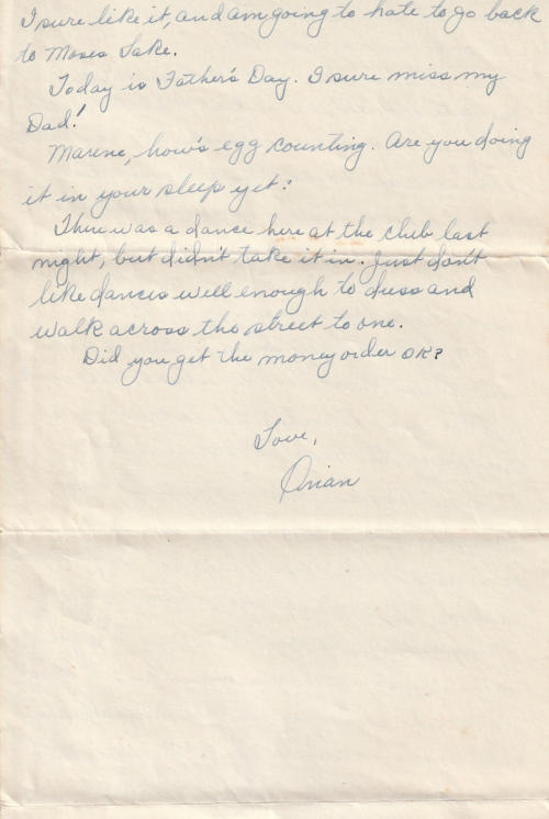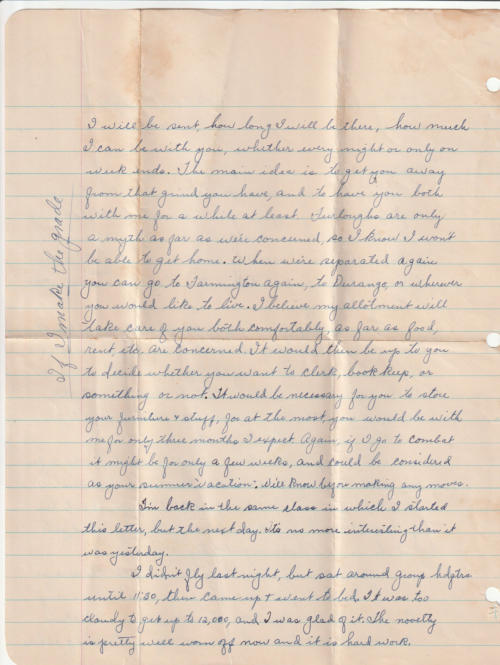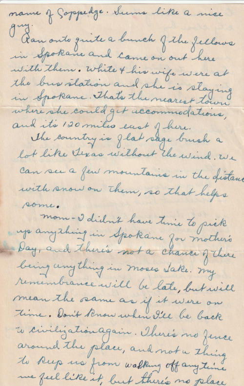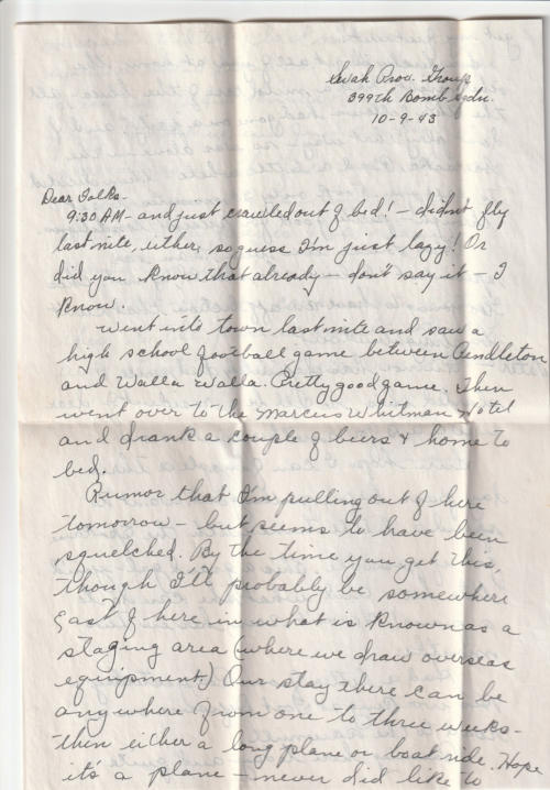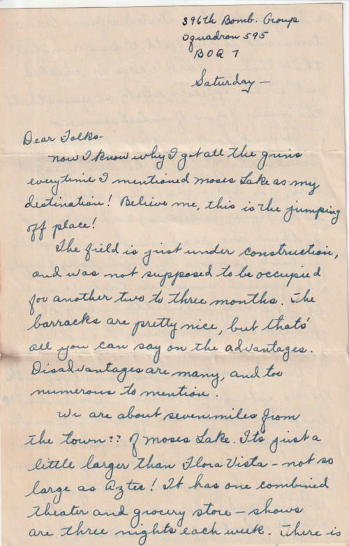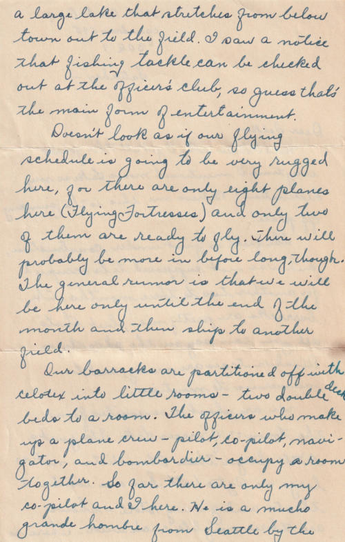 p1: Dear Folks, Now I know why I got all the grins everytime I mentioned Moses Lake as my destination! Believe me, this is the jumping off place! The field is just under construction, and was not to be occupied for another two to three months. The barracks are pretty nice, but that’s all you can say on the advantages. Disadvantages are many, and too many to mention. We are about 7 miles from the town of Moses Lake. It’s justa little larger than Flora Vista, not so large as Aztec! It has one combined theater and grocery store - shows are three nights each week. There is p2: a large lake that stretches from below town out to the field. I saw a notice that fishing tackle can be checked out at the officer’s club, soI guess that is the main form of entertainment.