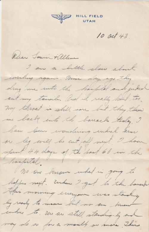•1-Orian US Army Air Forces Bombardier 1942-44oSchooling era letters •Walla Walla, Washington▪Uncertain Dates-88th Bomb Grp•Tues •Thurs•Sun▪9-8-1943▪10-6-1943▪10-9-1943•Moses Lake, Washingtonounknown date- 96 Bomb Group Sq 595 BOQ7•Kelly Field, Texaso9-25-1942 Scolding sister Marene over dating•Big Springs, Texas 1943•Ellington Field, Texas